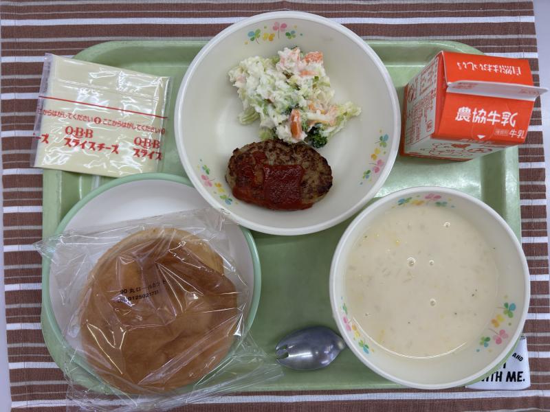 スープは、みんなが大好きなコーンポタージュです。粒のコーンとクリームコーンを入れました。