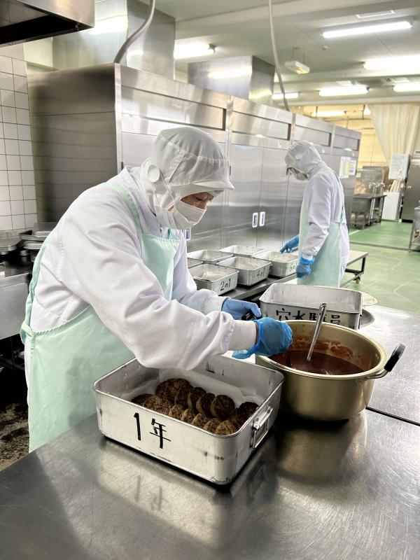 今日の給食は、配送校の穴水小学校の6年生が考えた献立です。みんなが残さず食べられる給食をテーマに考えてくれました。ハンバーグはトマトソースをかけ、チーズと一緒にパンにはさんで食べます。