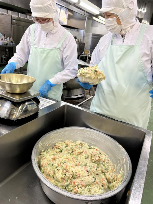 ポテトサラダには、ブロッコリーやキャベツ、にんじんなど野菜をたっぷり入れました。