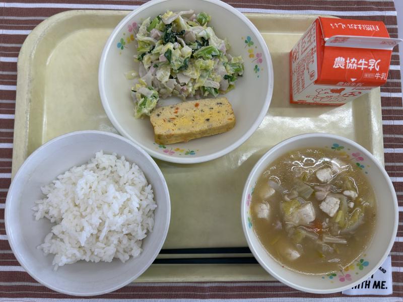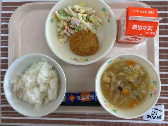 今日の副菜は野菜たっぷりのマカロニサラダです。キャベツ・にんじん・とうもろこし・ブロッコリーが入っています。白菜のみそ汁には、地元のしめじを使いました。野菜の甘味が出て、おいしく仕上がりました。