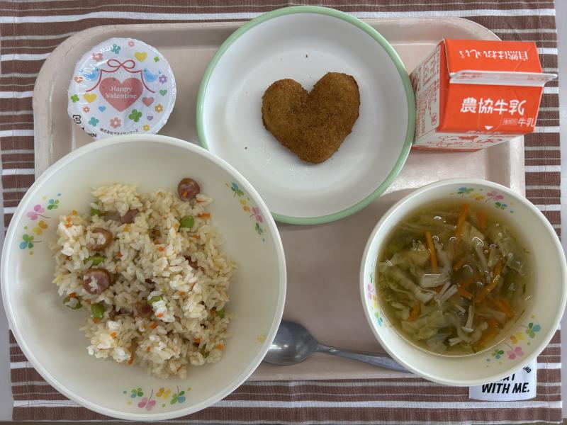 今日は、バレンタインの行事食です。ハートのコロッケに、ハートのチョコプリンとかわいいメニューになりました。子どもたちは、コロッケを半分に割って、「あー失恋したー!」と盛り上がっていました(* ´艸`)