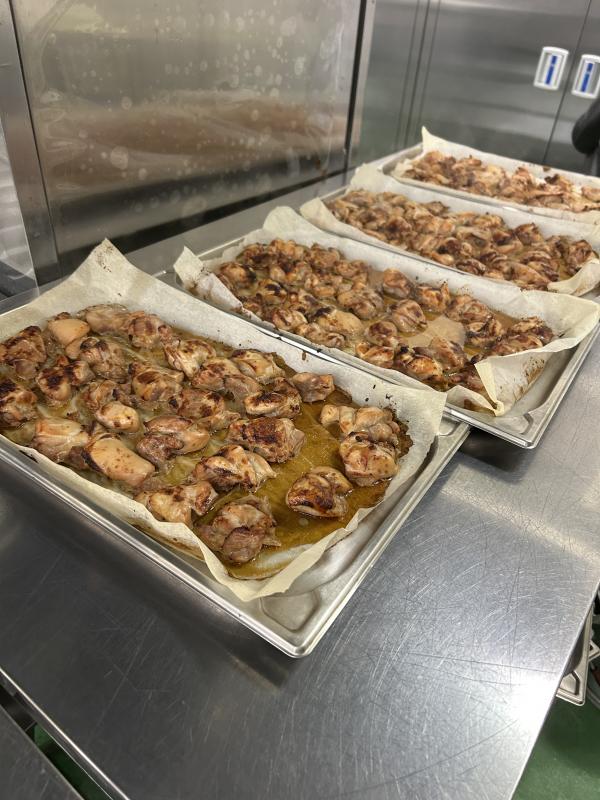 今日の主菜は、「鶏肉の照り焼き」です。調味料に漬け込んで、スチームコンベクションオーブンで焼きました。しっとりとごはんに合う味に仕上がりました。