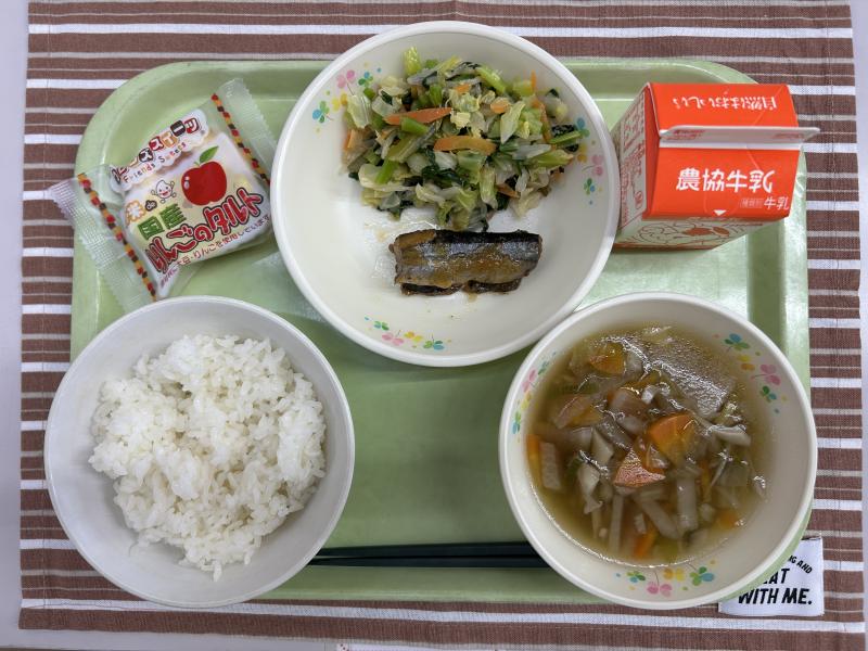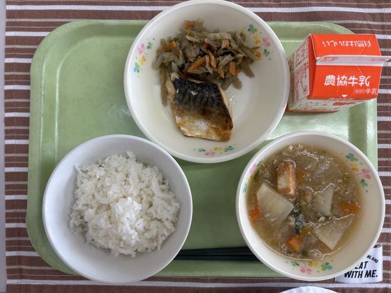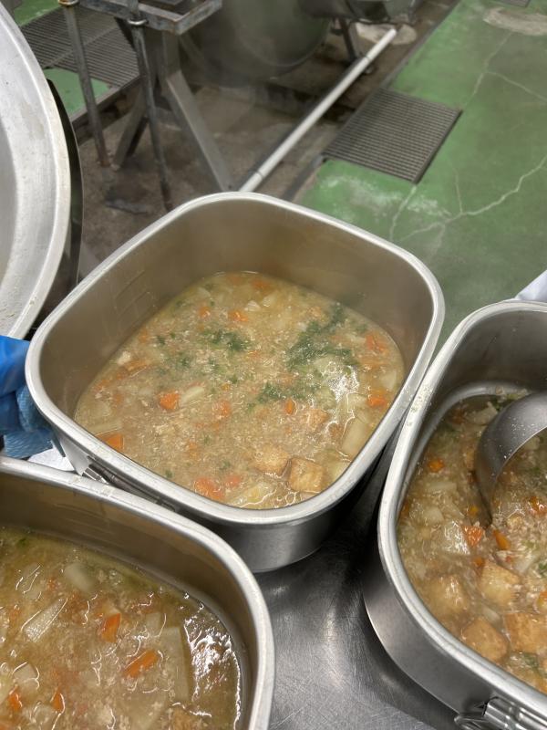 今日の汁ものは「大根のそぼろ煮」です。今日給食で使った大根は、2年生が生活科でお世話になった大隅さんが育てた大根です。「おでん大根」という品種で、大きくて味染みがよく、早く煮えるのが特徴です。