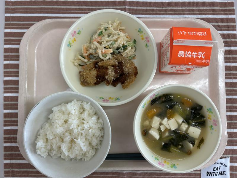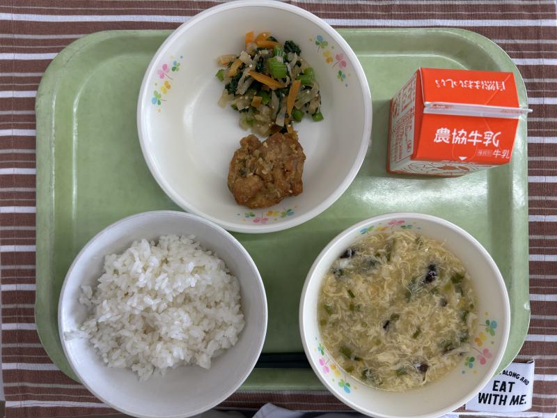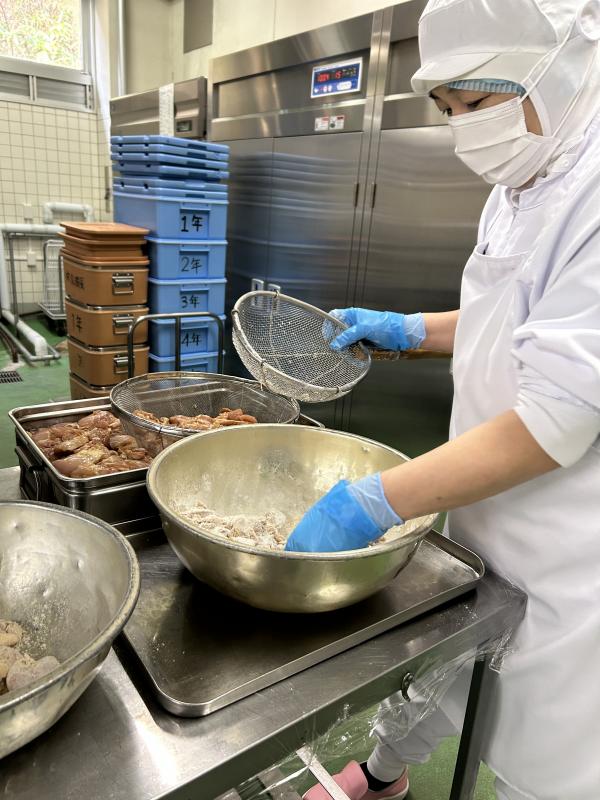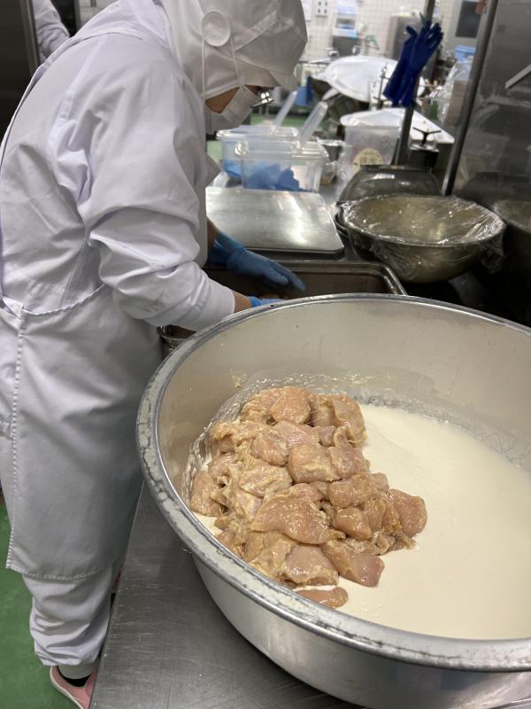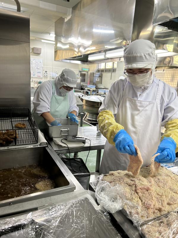 今日の給食は中華料理でした。油淋鶏は下味をつけた鶏肉に、1つ1つ丁寧に衣をつけ揚げてから、ねぎやしょうがで作ったタレをからめます。ごはんがすすむ味に仕上がりました。