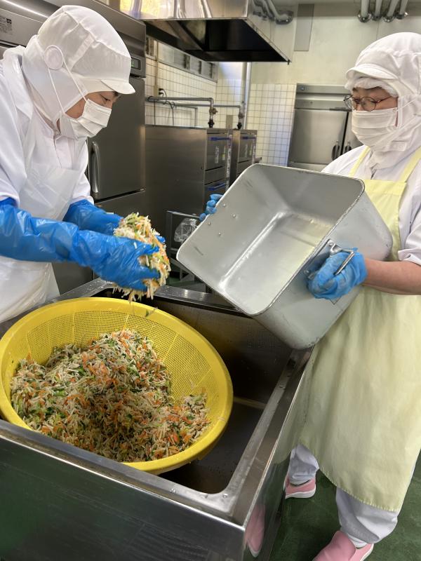今日の副菜は「くきわかめのあえもの」です。こりこりした食感が特徴のくきわかめと野菜を白みそやコチュジャンなどで作った調味料で和えました。さっぱりした味で食べやすかったのですが、子どもたちはくきわかめが苦手な子が多かったです