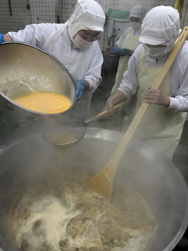 また、スープはたまごが入った忠かスープです。血などが混ざっていないか確認しながら、たまごを割ります。片栗粉でとろみをつけたスープに、ザルでこしながらたまごを入れることでふわふわとキレイに仕上がります。