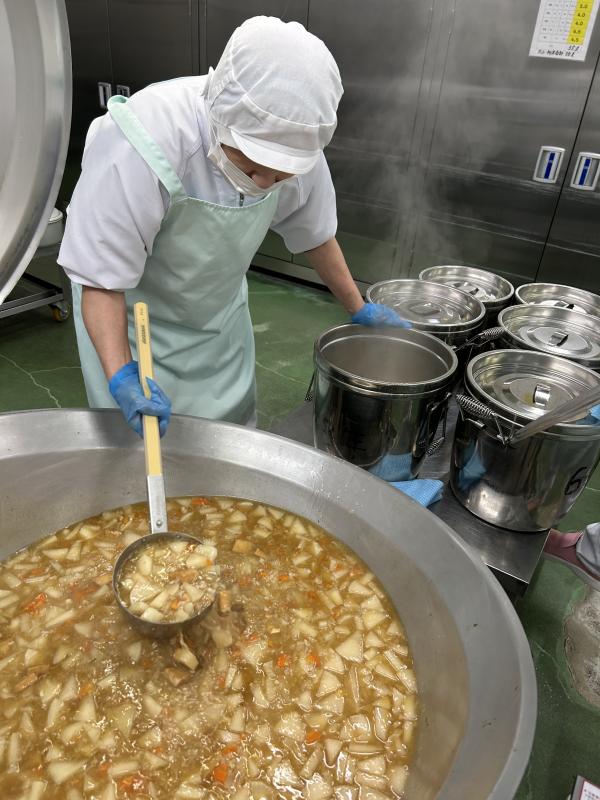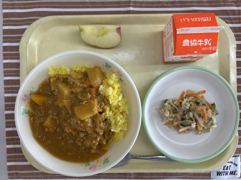 今日のカレーは、冬野菜カレーです。れんこん、ごぼうが入っています。また明日は冬至ということで、かぼちゃも加えました。ごはんは、ターメリックを入れ黄色がきれいなごはんに仕上げました。