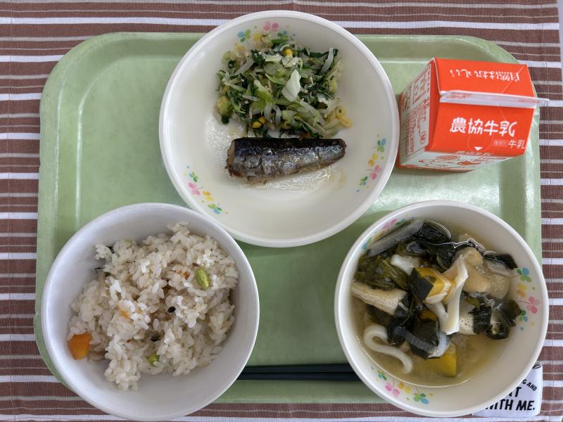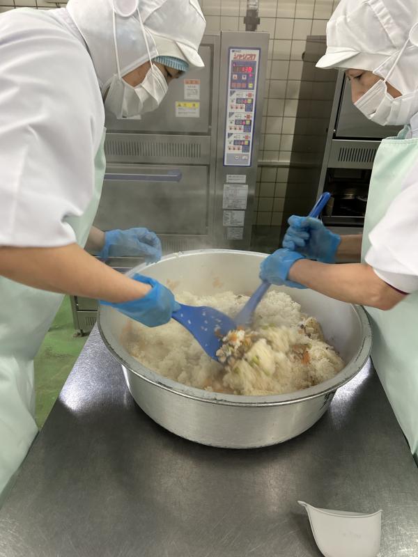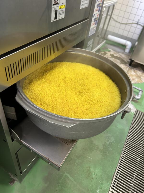 今日は先月提供できなかった「秋を感じる丸ちゃん給食」の主食の「炊き込みごはん」です。調理場の都合で、丸山さんが考えた献立通りにできなかったので、今日提供しました。