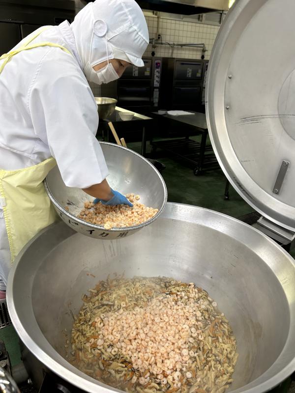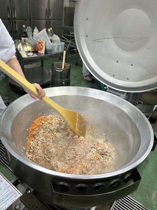 給食のちらしずしは、日本酒と昆布を入れて、かために炊いたごはんに、すし酢をいれて、別で炊いた具を混ぜ込んで作ります。手間のかかる作業ですが、調理員さんたちはおいしく仕上げるために丁寧に作業してくれています。