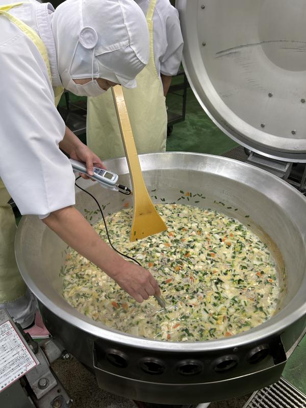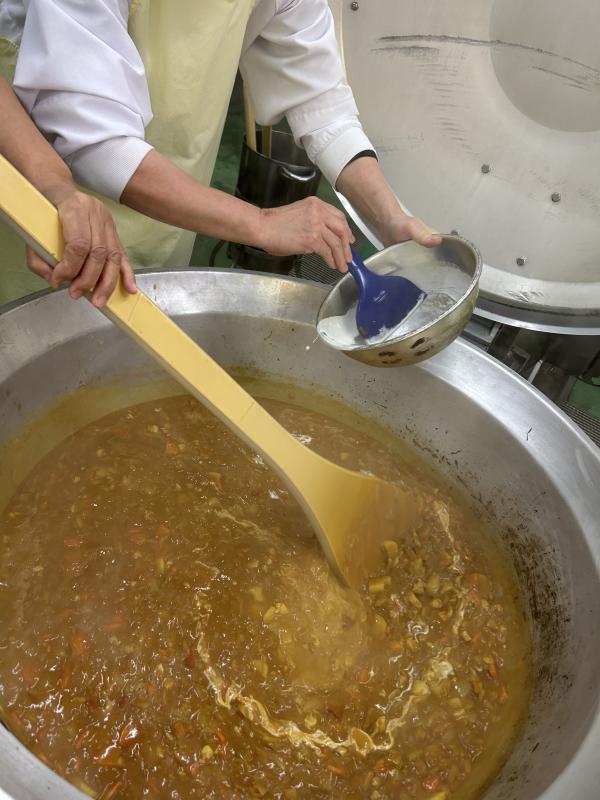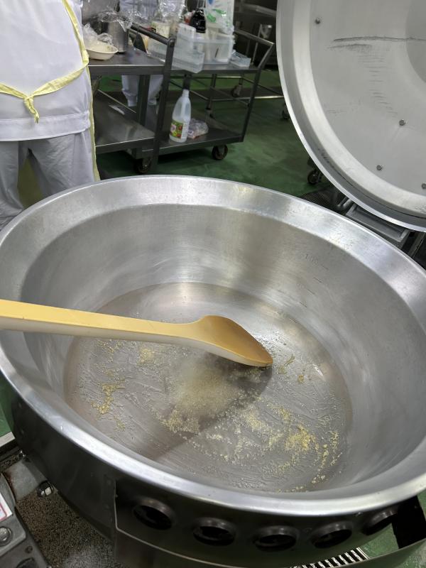 今日の汁物は、「麻婆豆腐」です。給食の麻婆豆腐は、具がたっぷり!たまねぎ、にんじん、しいたけ、ねぎ、にら、豚肉が入っています。にんにくやぎょうが、トウバンジャンを炒め、赤みそで調味します。水っぽくならないように仕上げるために豆腐は別の釜で茹でてから加えます。