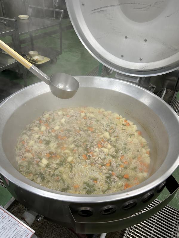 今日の汁物は、「塩肉じゃが」です。普通の肉じゃが、カレー肉じゃがに続き、3パターン目の肉じゃがの登場です。塩肉じゃがと普通の肉じゃがの違いは、しょうゆを使わないことと、にんにくや鶏ガラだしを使用することです。にんにくをよく炒め香りを出し、具材を炒めて煮込みます。野菜の甘味と塩味がよく合う肉じゃがに仕上がりました。