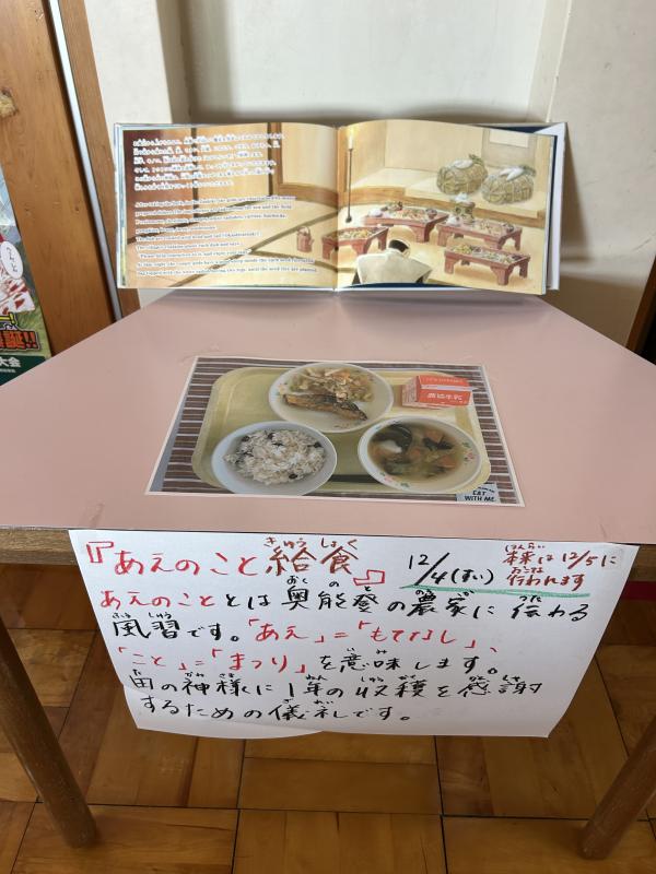 今日の給食は、「あえのこと給食」です。「あえのこと」とは、奥能登の農家に伝わる風習で、「あえ」=「もてなし」、「こと」=「まつり」を意味します。田の神様に、1年の収穫を感謝するための儀礼で、ユネスコの無形文化遺産に登録されています。給食時には、「あえのこと」について話しました。