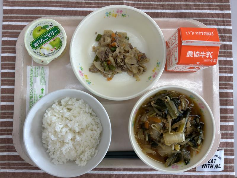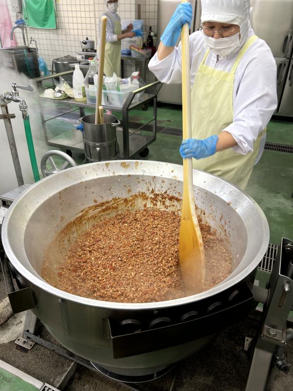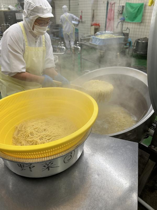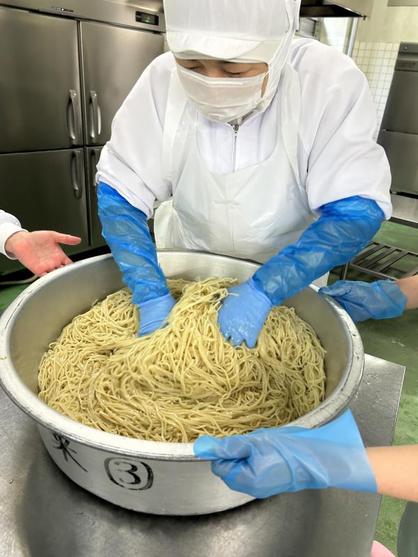 今日の汁物は「担々麺」です。先月巡回校の児童から「ラーメン食べたい」とリクエストがあったので入れてみました。肉みそを作り、野菜を煮込んでスープを作ります。麺は茹でて、スープとは別で配缶します。そうすることによって、麺がのびずに食べられます。麺が多いかなと心配しましたが、みんなおいしいと食べてくれました。