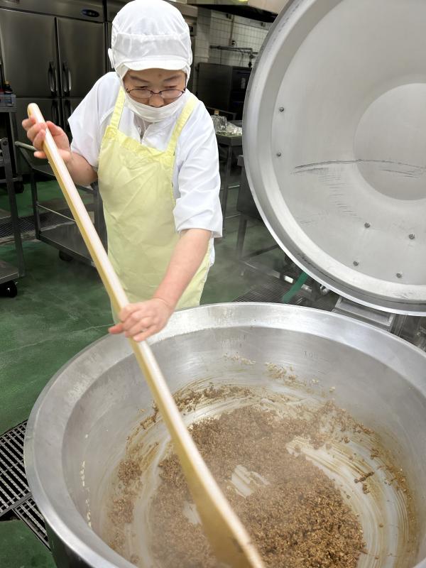 今日の汁物は八宝菜です。しょうがやにんにくを炒めて香りを出し、はくさいやにんじん、豚肉、いかなどを煮込みとろみをつけて仕上げます。うずらの卵は1人1個はあたるように調理員さんが数を数えて食缶に入れてくれています。別のなべで煮て下味をつけているのて味がしみいました。今日は急に寒くなったので、とろみついた八宝菜で温まりました。