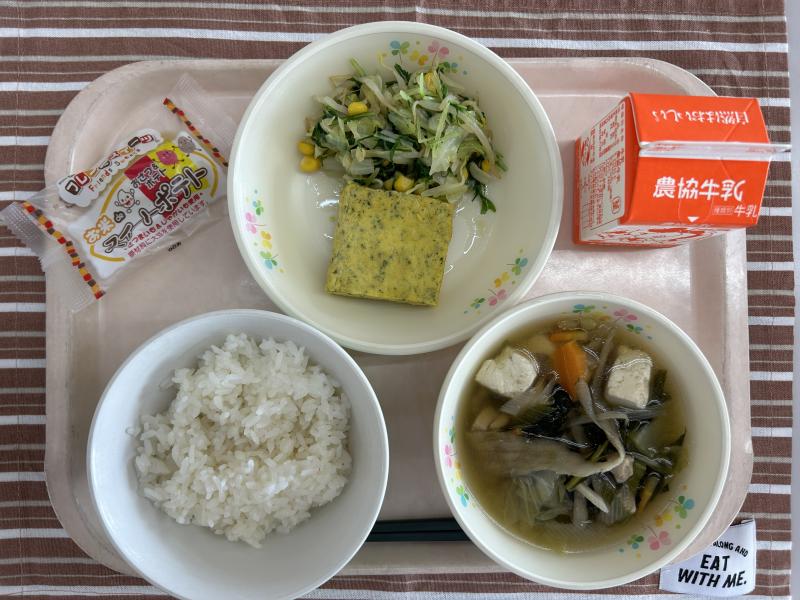 ※さばのしょうがみそ焼きの予定でしたが、仕上がったものを味見した際に異臭があり、子どもたちに提供できないと判断しました。急遽、明日使用予定だったミートオムレツを提供しました。