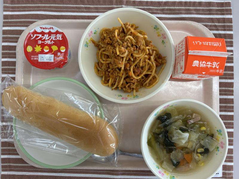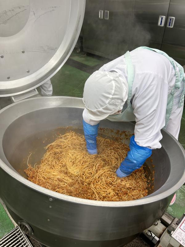 今日はみんな大好きスパゲッティミートソースです。給食のスパゲッティは、ソースに具がたっぷり!スパゲッティの麺よりソースが多いくらいです。今日のミートソースには、豚肉・牛肉・大豆・たまねぎ・にんじん・エリンギ・トマトなどが入っています。大きな釜でソースを作り、隣でスパゲッティをゆでます。出来上がったソースとスパゲッティを合わせて出来上がり!みんなパンにはさんだりして、口を真っ赤にして食べていました(^▽^)