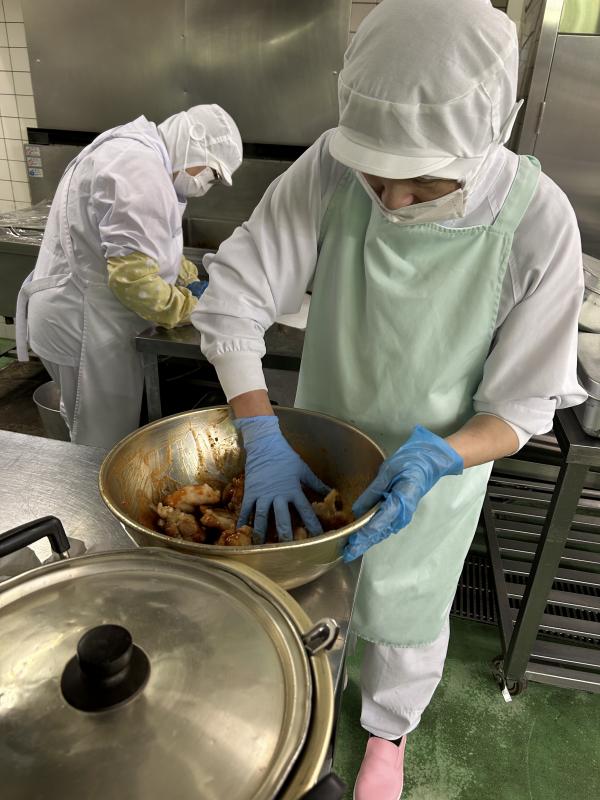今日の主菜は「ヤンニョムチキン」です。ヤンニョムとは、韓国の合わせ調味料のことです。給食では、ケチャップやにんにく、コチュジャンで作ったタレを揚げた鶏肉にからめました。