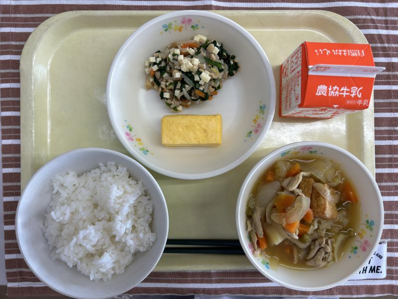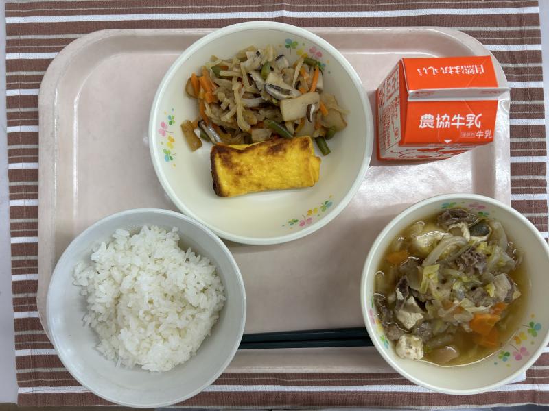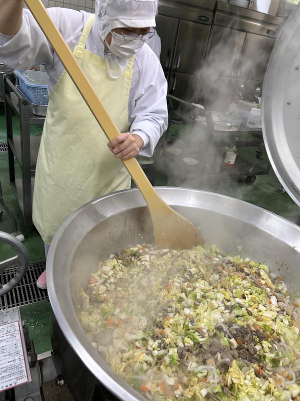 今日の汁物は、「白菜のすき焼き風煮」です。白菜だけでなく、ごぼうやにんじん、たまねぎ、ねぎ、こんにゃく、とうふ、牛肉、車ふなどたくさんの食材を使用しました。それぞれの食材からうま味が溶け出ておいしく仕上がりました。