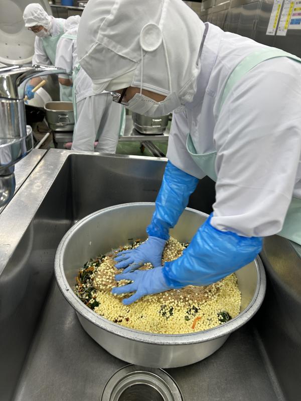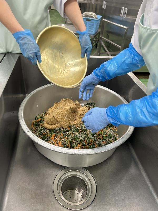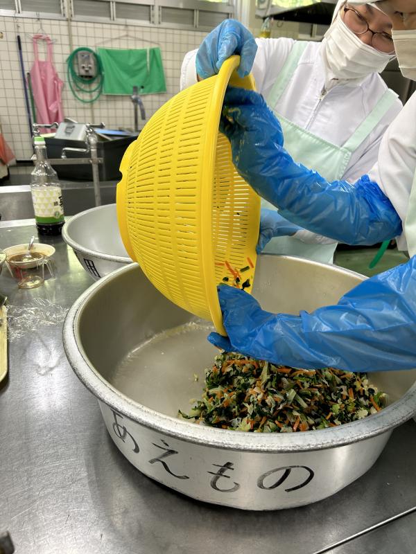 今日の副菜は、「チーズ納豆」です。奥能登地区では、定番メニューだそうです。ほうれん草やにんじん、もやしを茹で、納豆と角切りのチーズを合わせ、しょうゆとみりんで作ったタレを入れて混ぜ合わせます。子どもたちは、ごはんにかけたりして食べていました。