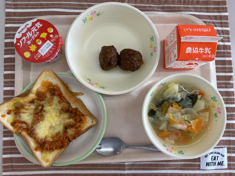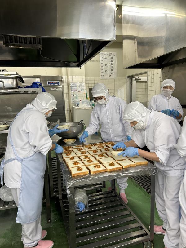 今日は初メニューの「ピザトースト」です。調理場で1枚1枚ソースをぬり、チーズをかけてオーブンで焼きました。調理場内にパン屋さんのようにいい香りが漂っていました。