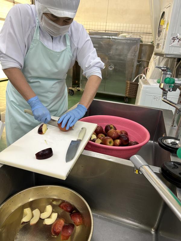 今日のデザートはりんごです。長野県産の「秋映」という品種のりんごが届きました。給食では、丁寧に洗ったりんごを皮付きのまま提供します。