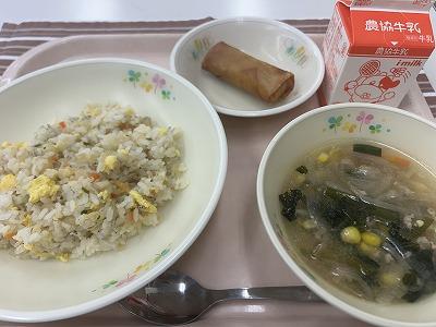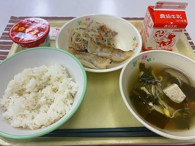 今日の給食は、中華料理です。五目中華みそスープは、はるさめ、にんじん、豚ひき肉、コーン、にらなど具沢山です。中華スープをみそ味で仕上げているので、ご家庭でも簡単につくれますよ!はるさめも合いますが、ラーメンやワンタンを入れてもおいしくできます。
