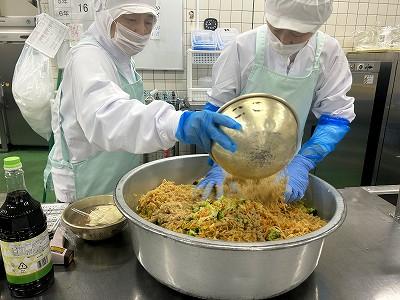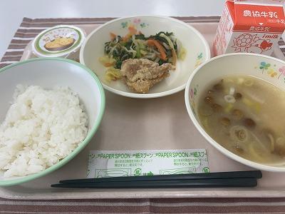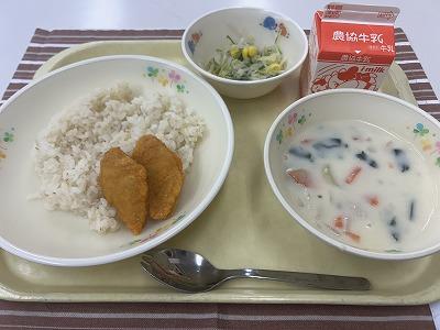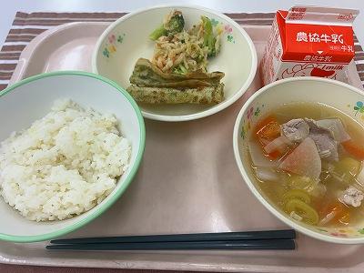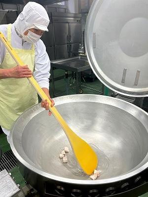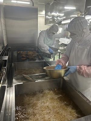 今日から30日までの学校給食週間中は、毎日いろいろは地域のメニューを提供します。1日目は「北海道」をテーマにしました。北海道では、「ザンギ」とよばれる鳥のから揚げが有名です。今日はそのザンギをアレンジして、北海道でよく水揚げさける鮭で「鮭ザンギ」にしました。にんにくとしょうが、しょうゆ、酒で下味をつけ揚げます。香ばしい香りで食欲がわいてきます。「どさんこ汁」は、北海道でたくさん作られている野菜を使った汁ものです。じゃがいも、たまねぎ、にんじん、とうもろこしなどが入っています。最後にバターを入れるのがポイントです。