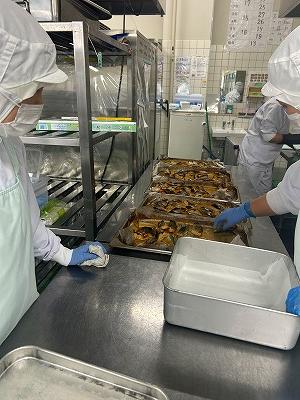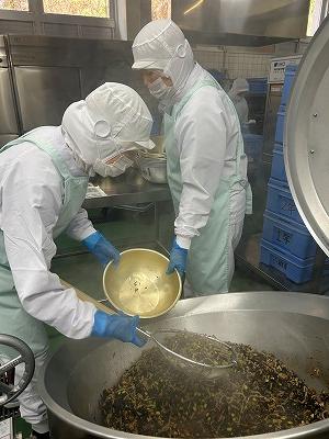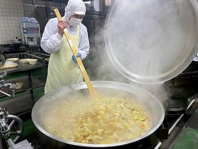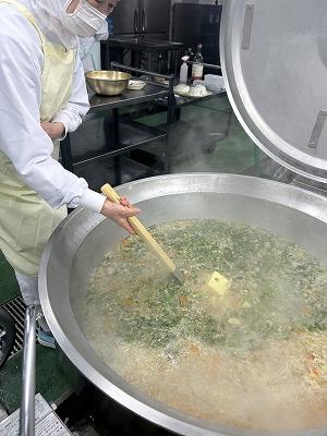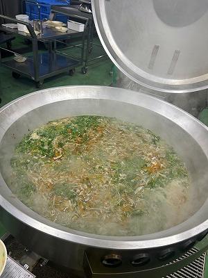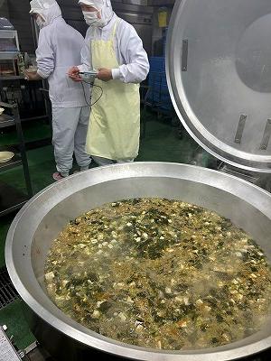 今日のスープは、2学期に家庭科の授業で6年生が考えた献立の中から選んだメニューです。今日はICTサポーターの森山先生が考えたものです。森山先生のこだわりは、牛脂でにんにくを炒めることです。いつものわかめスープと違った深みのある味に仕上がりました。森山先生の理想の味に近づけているかな?