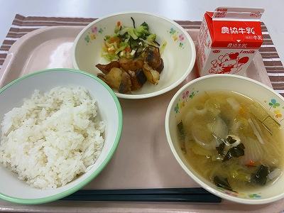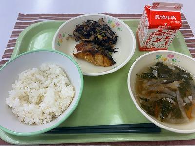 今日の給食は、和食です。さばはしょうがを入れたみそに漬け込み焼きました。いい色に仕上がりました。副菜は、ひじきの炒め煮です。石川県産のれんこんも入って食感がシャキシャキしています。えだまめを入れ彩りもよく仕上がりました。汁物は沢煮椀です。だいこんやにんじんをせん切りにしてあるのが特徴です。