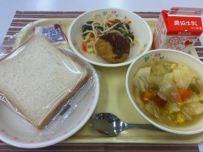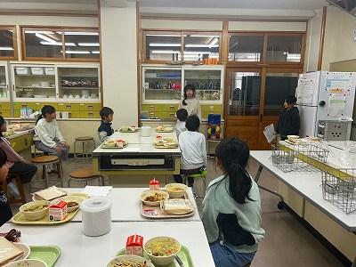 今日の汁物は、向さんが考案した「カレーポトフ」です。6年生が2学期に家庭科の授業「ゆうこりん杯」で1食分の献立を考えた中から選びました。じゃがいもやウインナー、キャベツなど野菜たっぷりでカレーの風味で食欲をそそります。給食時間には、向さんがみんなの前で気をつけたことについてなどお話してくれました。