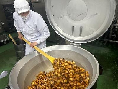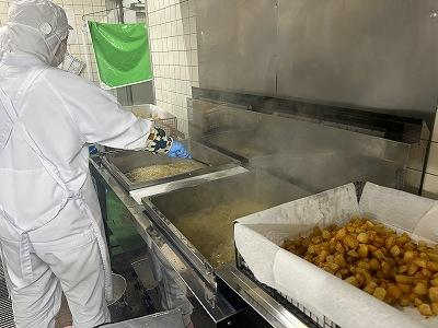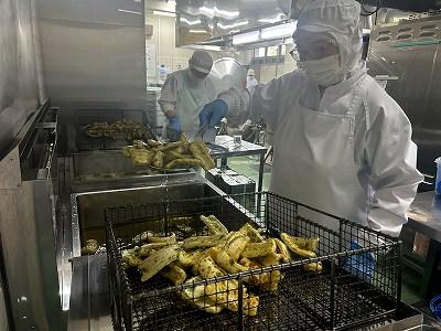 今日の主菜は、「ちくわの磯辺揚げ」です。1本のちくわを1/4にカットすることから作業は始まります。200本以上をカットするので、大変な作業です。でも手作りしたものはおしいですね!