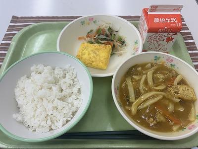 今日の給食は、久しぶりのカレーうどんです。豚肉や油揚げ、ねぎなどが入っています。今日も寒い日になったので、とろみのあるカレーうどんがおいしいですね!