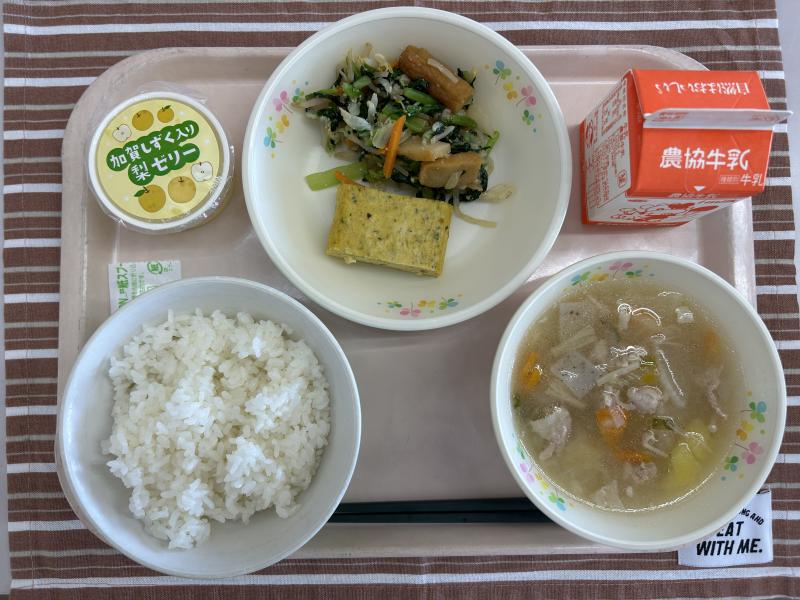今日の汁物は「沢煮椀」です。豚肉とたっぷりの野菜を野菜をせん切りにし、煮込んだ汁物です。「沢」には「たくさんの」という意味があります。むかし、猟師が日持ちする豚やいのししの肉をもって山に入り、山菜と一緒に煮込んだのが沢煮椀の始まりだと言われています。