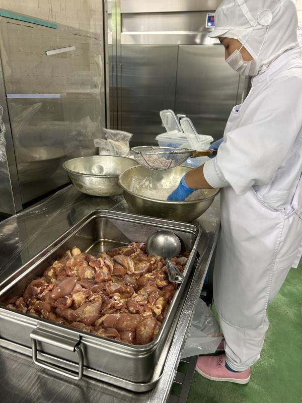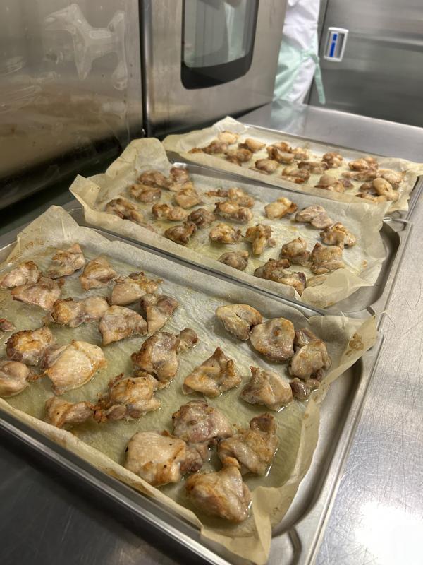 今日の主菜は「鶏肉の竜田揚げ」です。しょうがや醤油、酒で下味をつけた鶏肉に、1つ1つ丁寧に米粉と片栗粉をつけ揚げました。子どもたちにも大人気で、今日はみんな食べ終わるのが早かったです。