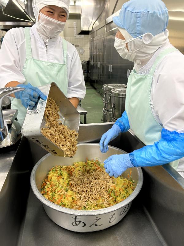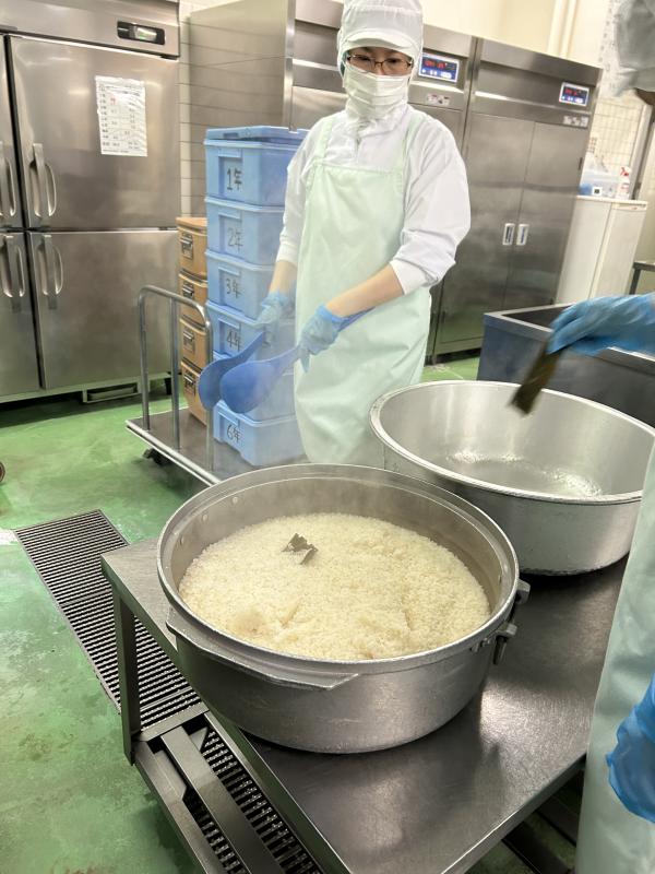 給食の混ぜごはんは、具を別に炊き、昆布や淡口しょうゆを入れて炊いたごはんと合わせて作ります。