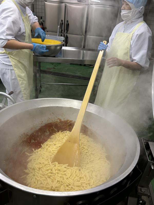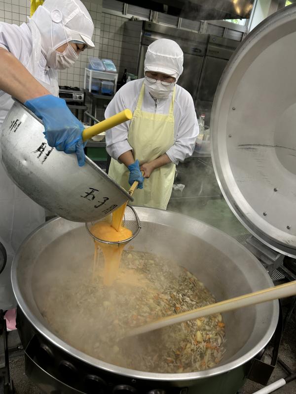 具は混ぜることを考えて少し濃いめの味付けにしています。調理場で炊いた炊き立てのご飯はやっぱりおいしいです!