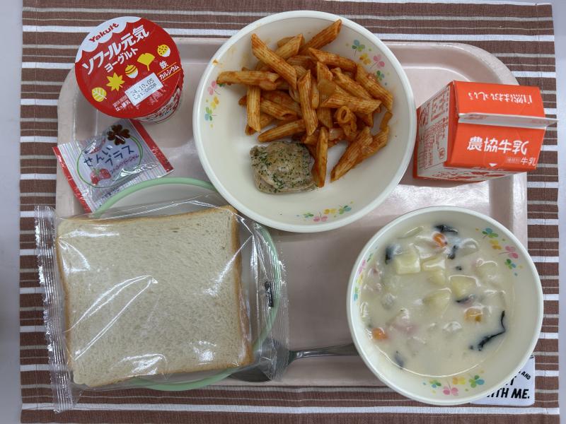 汁物には、かぼちゃやしめじが入っています。まだまだ暑い日が続きますが、献立は少しずつ秋に近づいています。