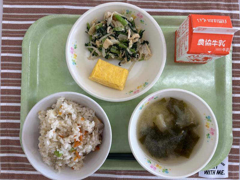「千草焼き」とは、たくさんの具を使った卵焼きのことです。ほうれん草やにんじんなどが入った彩りのよい卵焼きでした。この卵焼きは、穴水町に工場のある業者さんから仕入れました。ランチルームには、給食で使用した地場産物がわかるように毎日掲示しています。今日は、米・牛乳・豚肉・卵・じゃがいも・ねぎが地場産物でした。