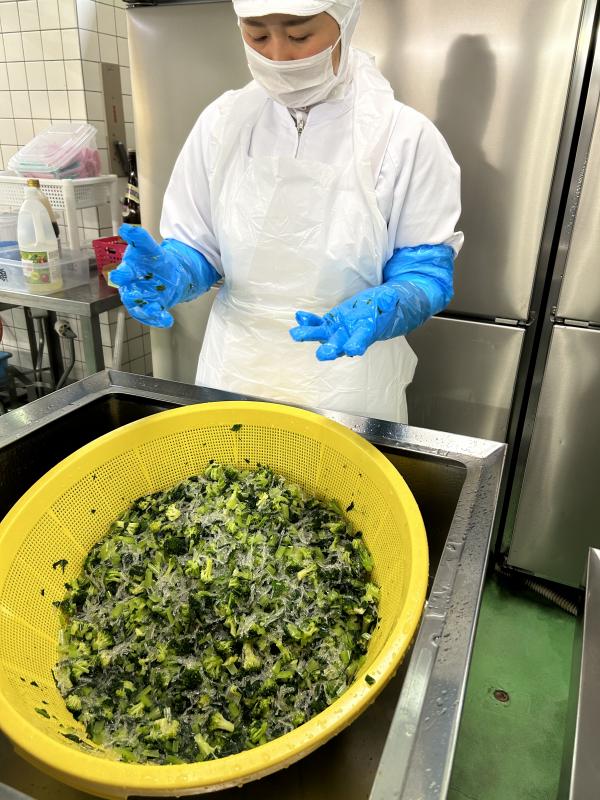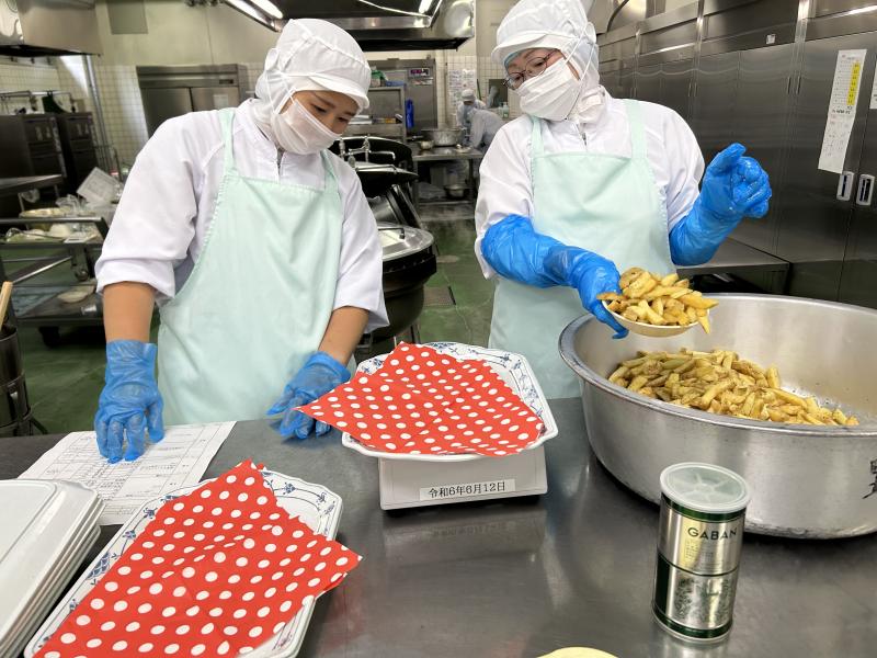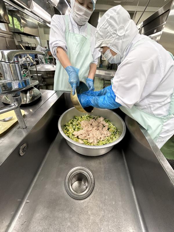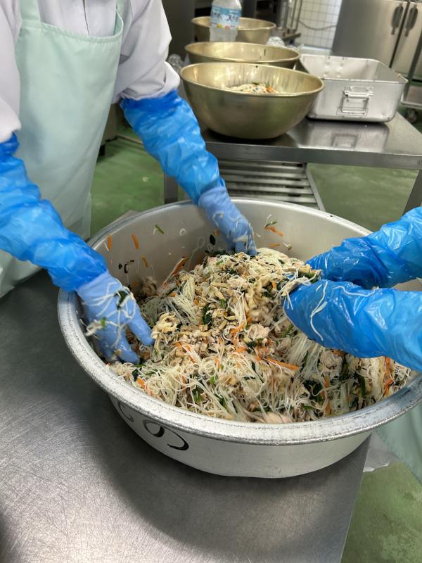 今日の給食は、初メニューの「冷やしそうめん」です。甘辛く炊いたしいたけと油揚げ、ほうれん草、にんじん、鶏肉が入り具だくさんです。ゆでたそうめんと具を合わせ、1人分の量を量り、クラスの食缶に入れます。