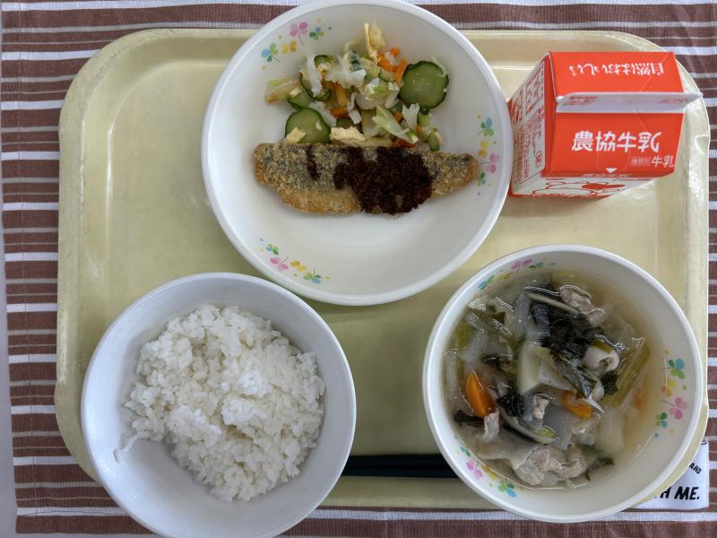 今日は今年度初の「キムタクごはん」です。長野県で有名で人気のある学校給食のメニューです。穴水町では以前から提供されていますが、今年度異動していた私は初メニュー!!キムチのからさもなく、たくあんの甘さとお肉のうまみでおいしかったです。子どもたちも人気で、食べ終わるのが早かったです。