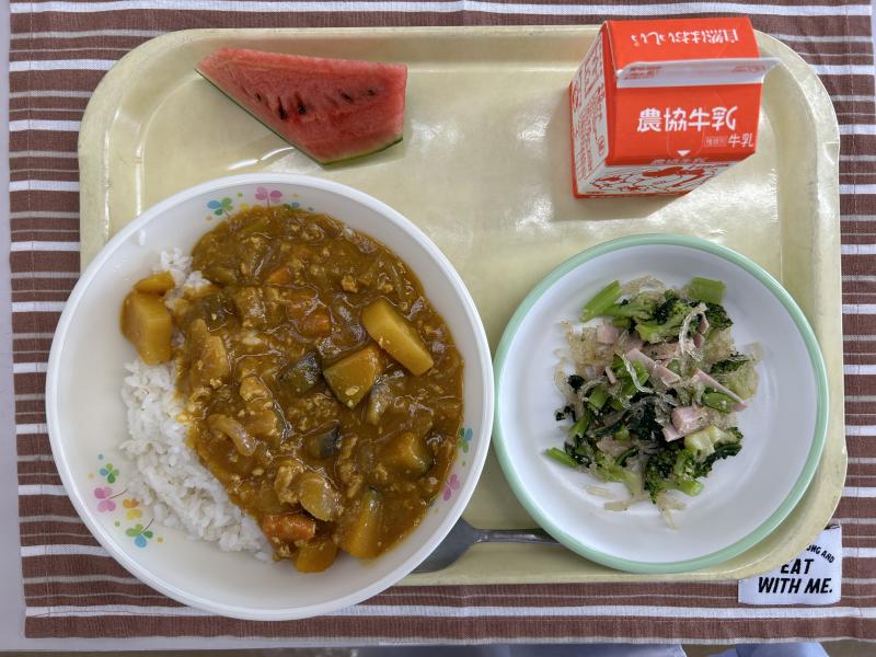 今日は1学期最後の給食です。無事終えることができ、ほっとしています。そんな最後の給食は、なす、かぼちゃ、パプリカなど夏野菜たっぷりのカレーライスです。学校中にいい香りが漂っていました。
