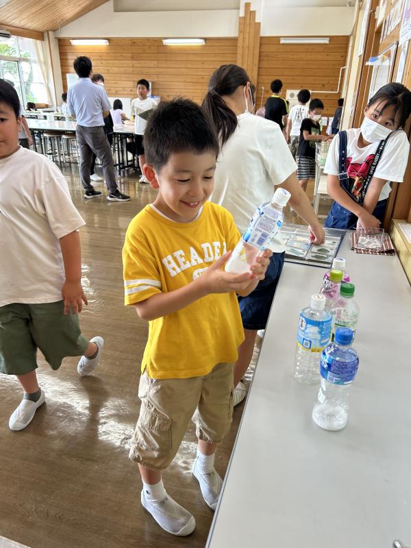 給食時間には、夏休みの食生活で気をつけて欲しいこととして、冷たいもののとりすぎに注意することと、給食がないので、牛乳や乳製品をとるように話しました。ジュースに含まれる糖分が目に見てわかるようにしました。子どもたちは、自分がよく飲むジュースを見て、「わぁ!さとう多い!」と言っていました。