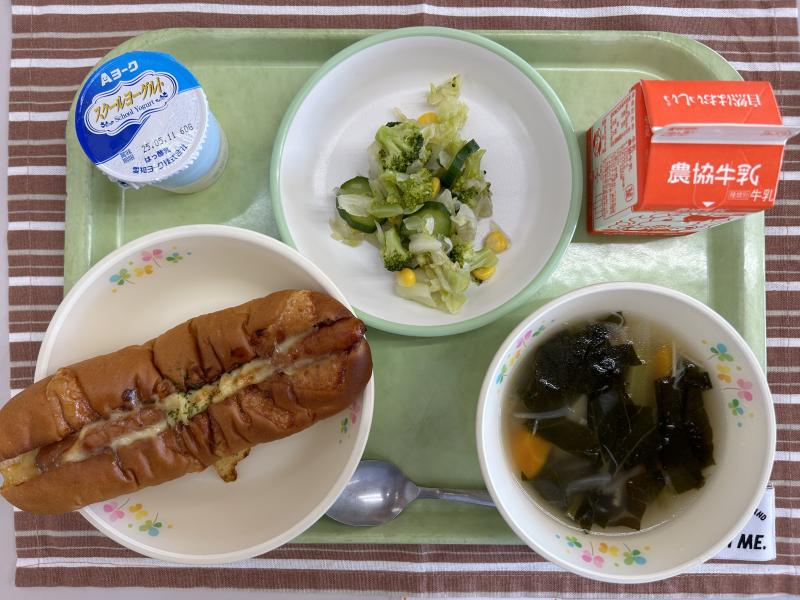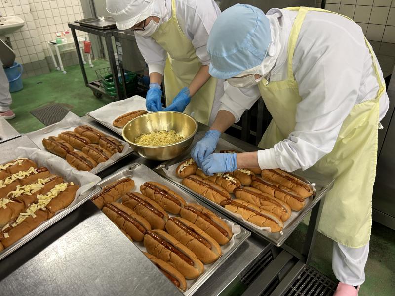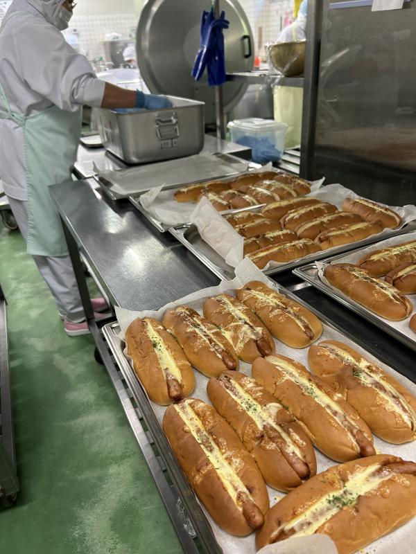 今日は初メニューの「チーズホットドック」です。コッペパンは切れ目があるものを業者さんに納入していただきました。コッペパンにケチャップをからめたウインナーをはさみ、とろけるチーズをかけてオーブンで焼きます。