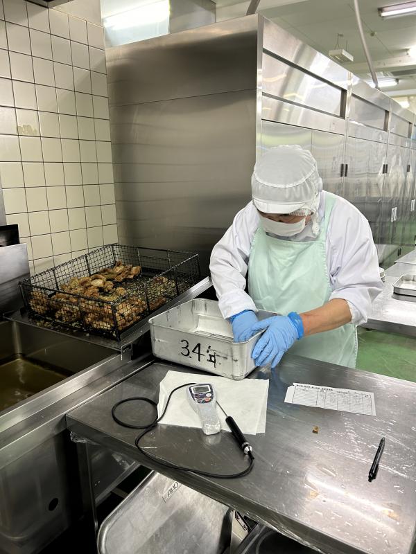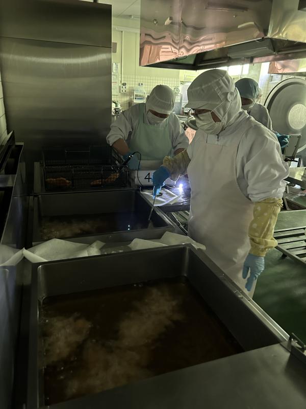 また、ちくわの磯辺揚げは、調理場の手作りです。ちくわを1/4にカットすることから始まります。衣をつけて、くっつかないように、揚げすぎないように気をつけて作業してくださいました。