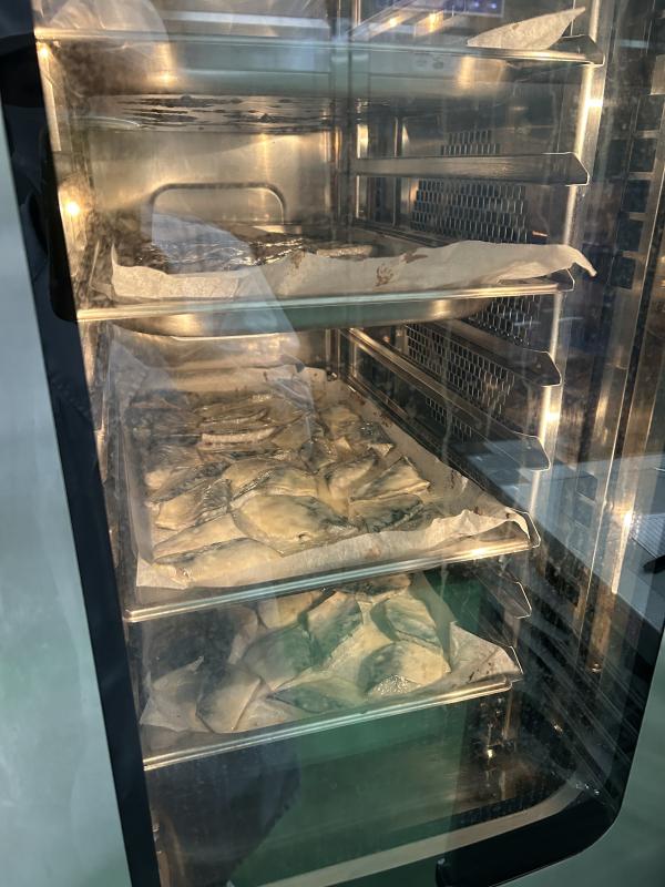 今日の主菜は、さばを塩こうじに漬け込んでスチームコンベクションオーブンで焼きました。スチームコンベクションオーブンは、スチームを出しながら加熱できる機械です。焼き加減にばらつきが出ないように、途中で向きを変えて焼いてくれました!今日のような和食!という感じの献立では、時間ないに食べ終わらない児童もちらほら。けれどみんな残さず食べてくれました!