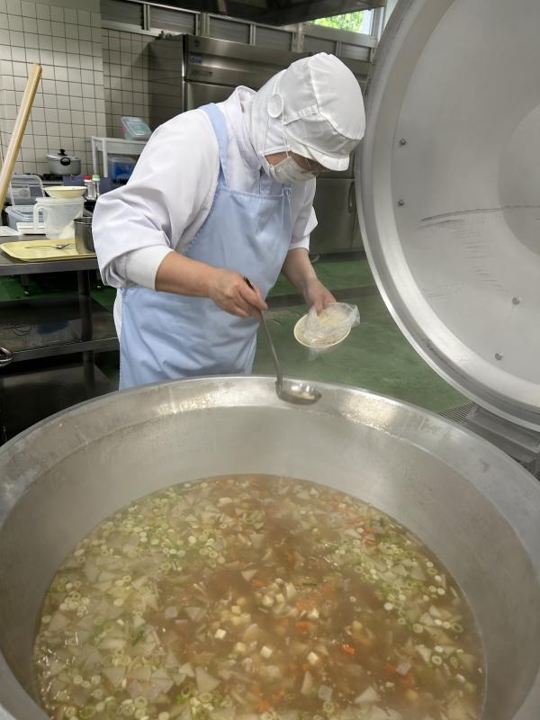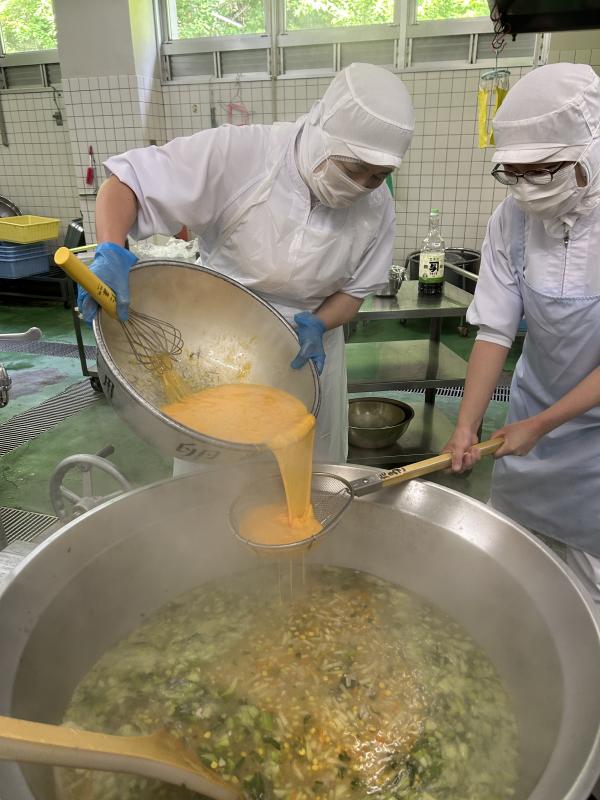 給食では、穴水町でとれた卵を使用しています。1個1個調理員さんが血や殻が入らないように確認しながら割っています。スープに入れるときには、とろみをつけてから卵を入れるとふわふわに仕上がります。写真はザルでこしながら入れている様子です。こうすることで異物混入を防ぐことができます。