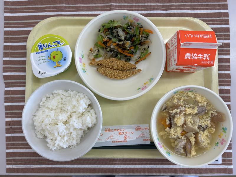 今日の汁物は、「のっけい汁」です。「のっぺい汁」は根菜やさといもなど具がたくさん入った汁物で、かたくりこでとろみをつけます。全国各地に存在する郷土料理ですが、新潟県が有名です。