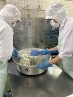 わかめを混ぜるのは調理員さんです。炊き立ての熱いごはんに、わかめを入れ、均等になるように