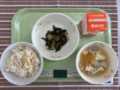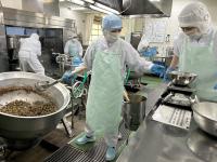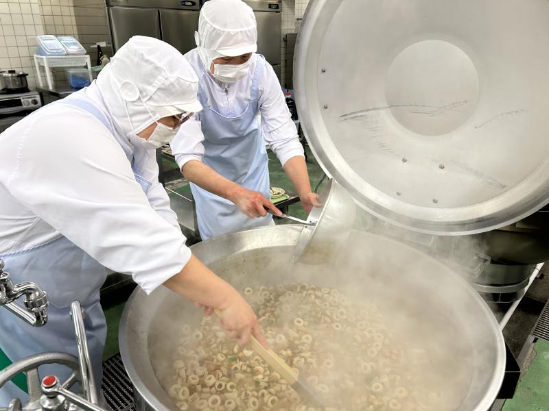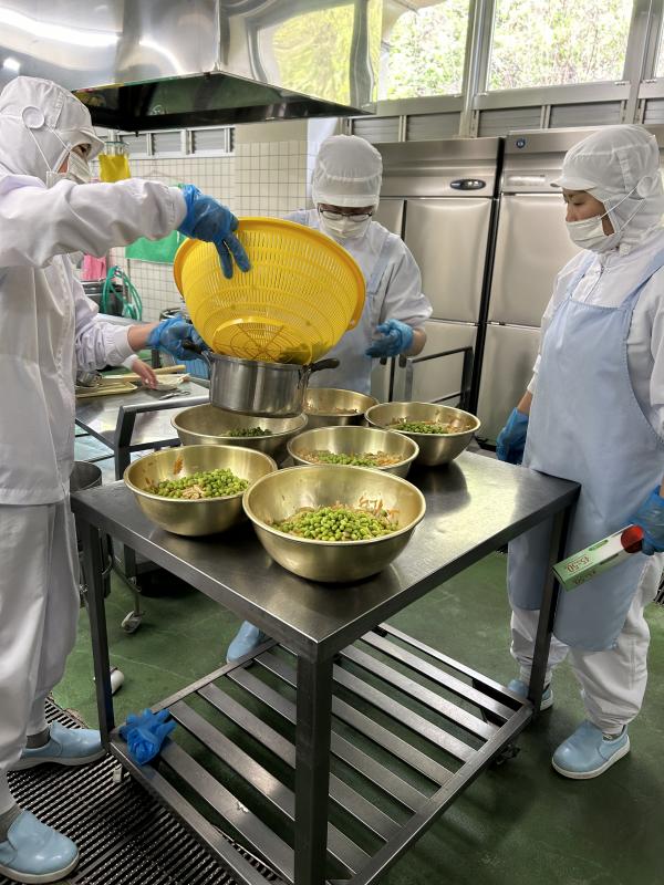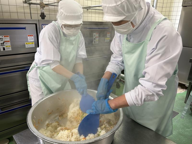 調理員さんたちは、混ぜた後のことを考えて味付けしています。旬の食べものはおいしいですね!
