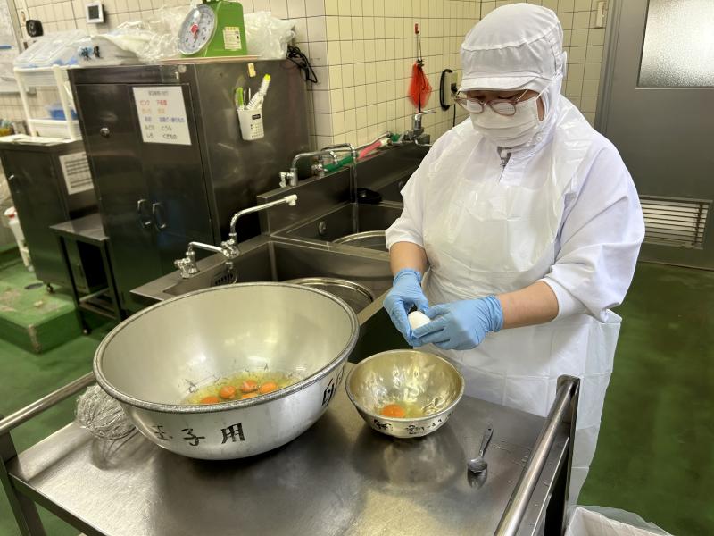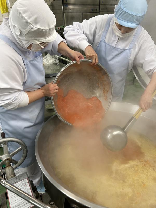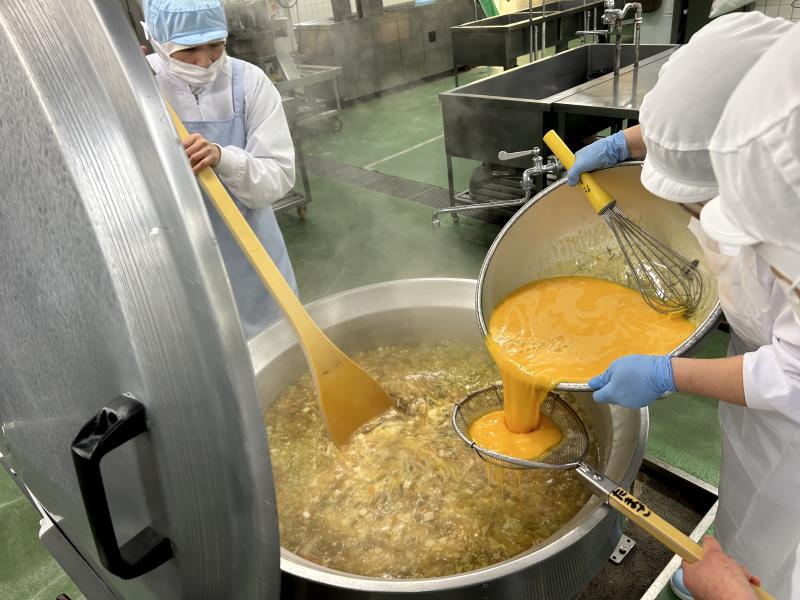 今日のスープは卵入りです。卵は地元のセイアグリーシステムさんのものを使用しています。1個1個調理員さんが確認しながら割ってくれています。スープにいれるときは、殻が入らないようにザルでこしています。